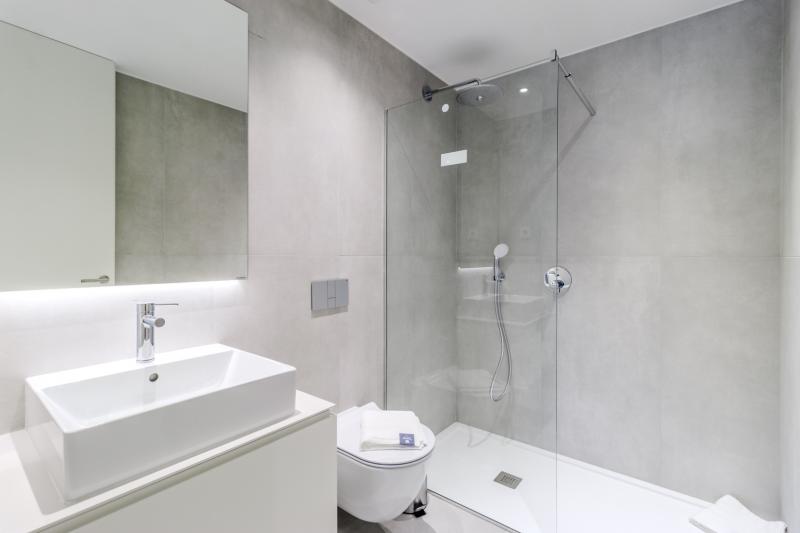 The master bedroom features an king-size bed, a built-in wardrobe, and a stylish en-suite walk-in shower. The second bedroom is configured as a twin room that shares access to a spacious walk-in shower room.