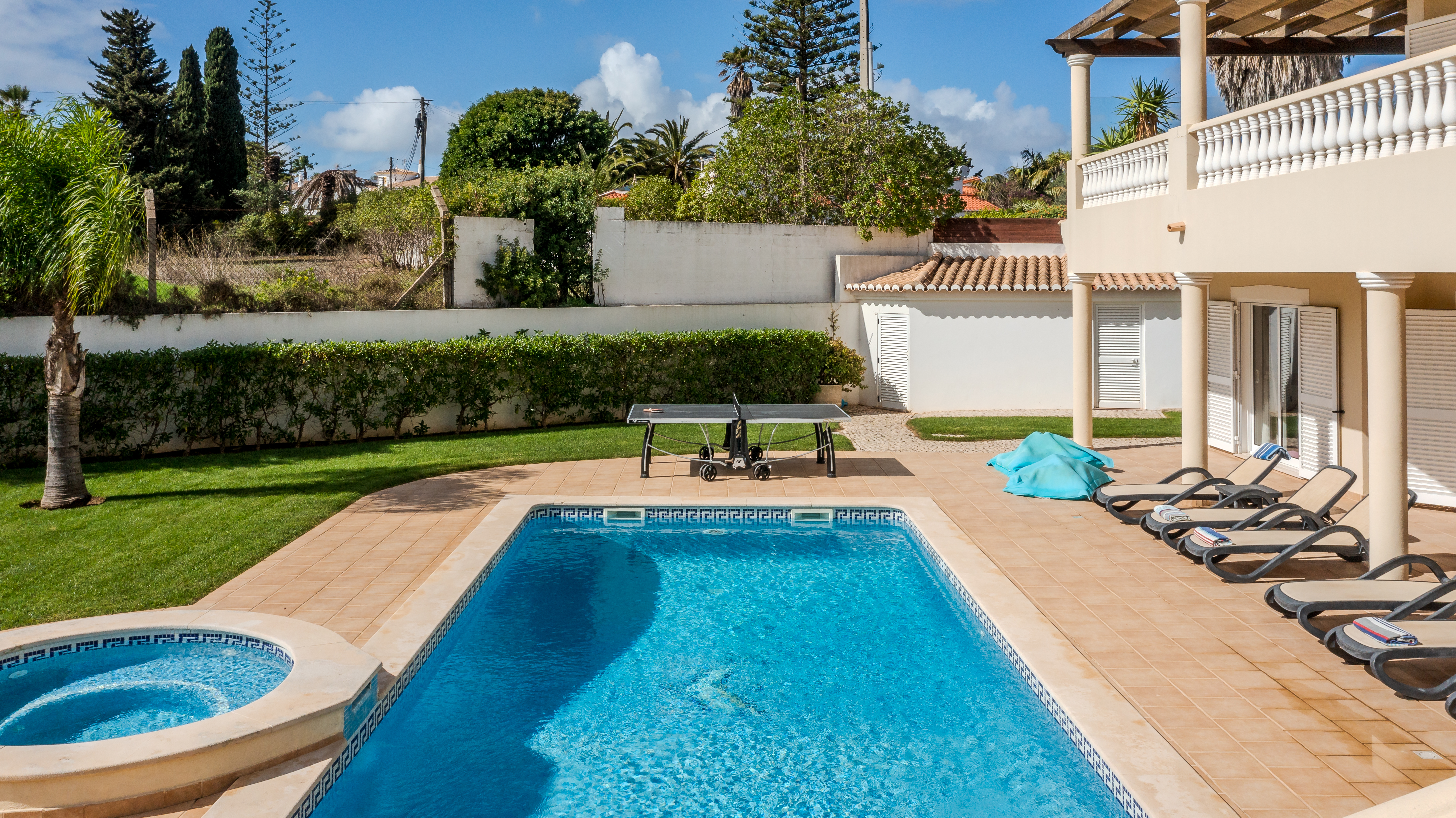 Further features include high speed internet connection, air conditioning throughout, ping pong table and cable TV. Thoughtful details include a hairdryer in each room, pool towels for each guest, rechargeable lamps for outdoors, and a speaker.