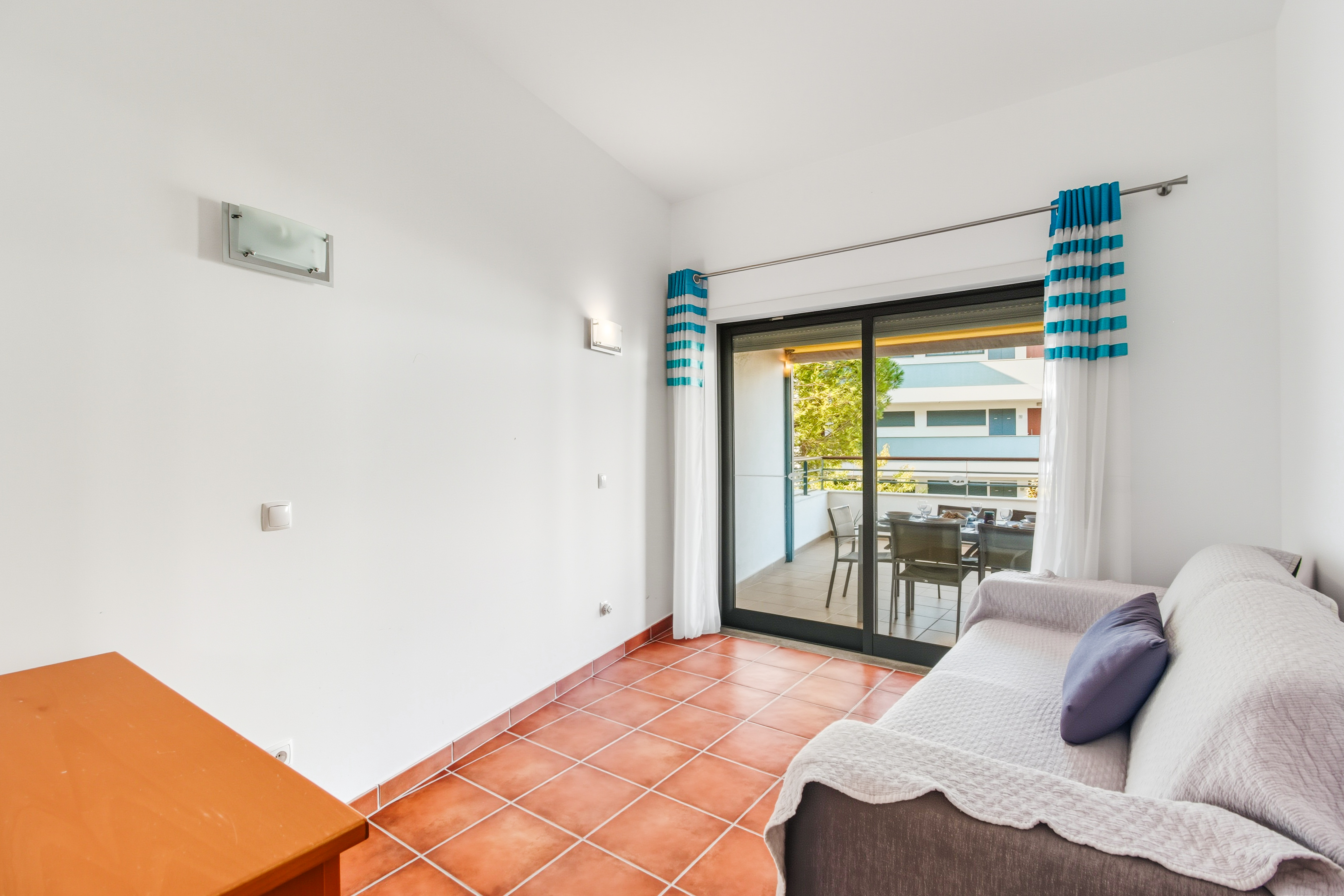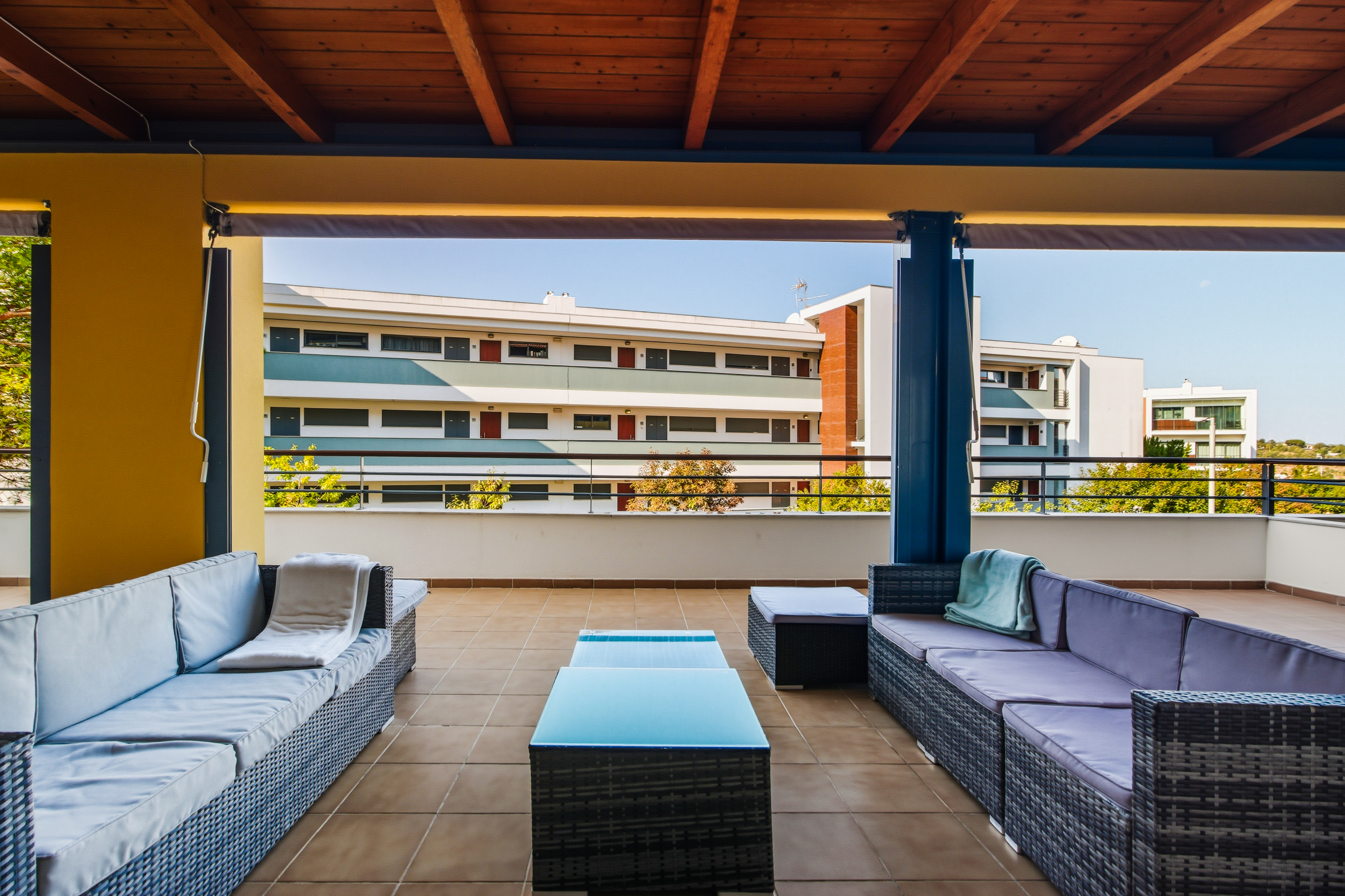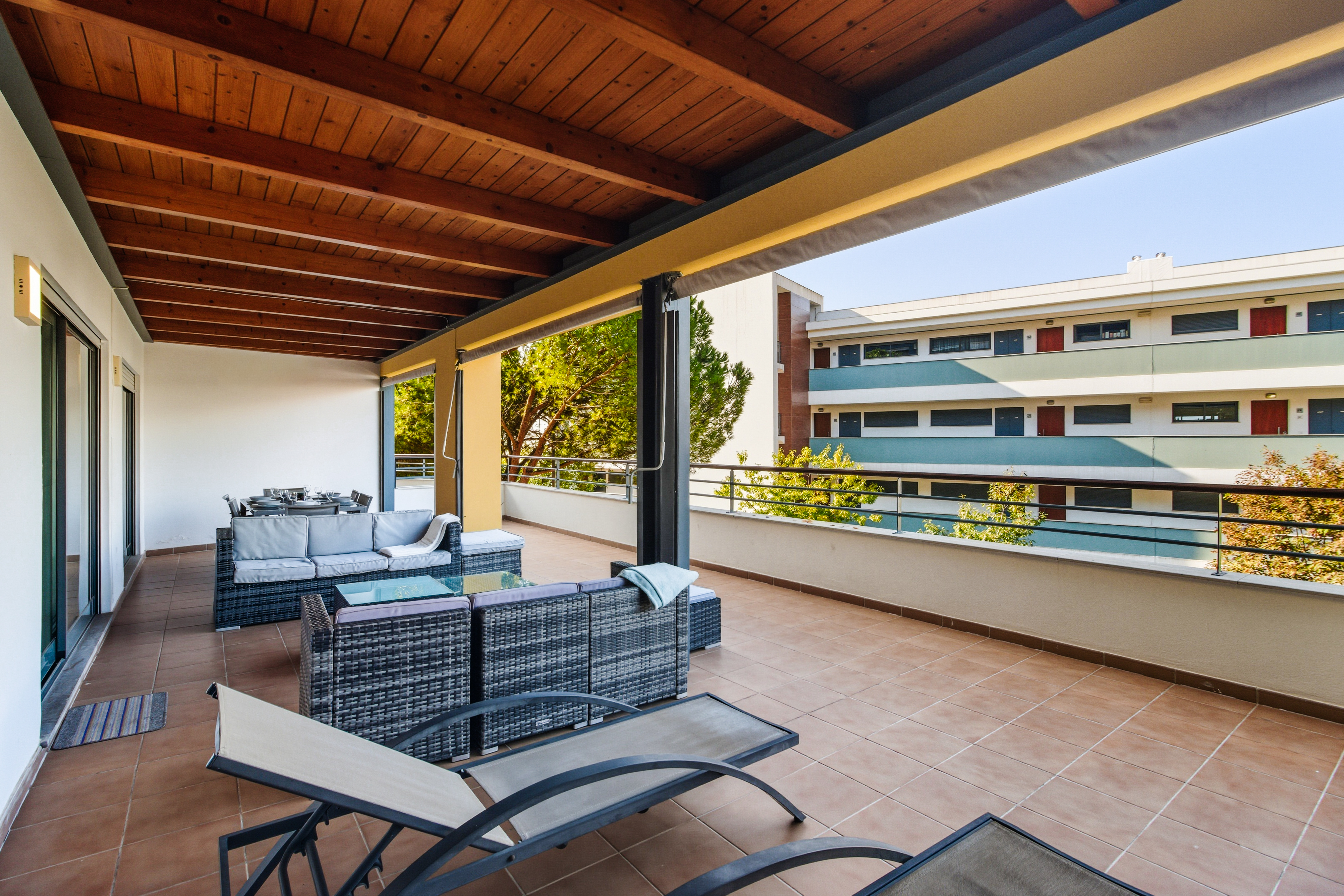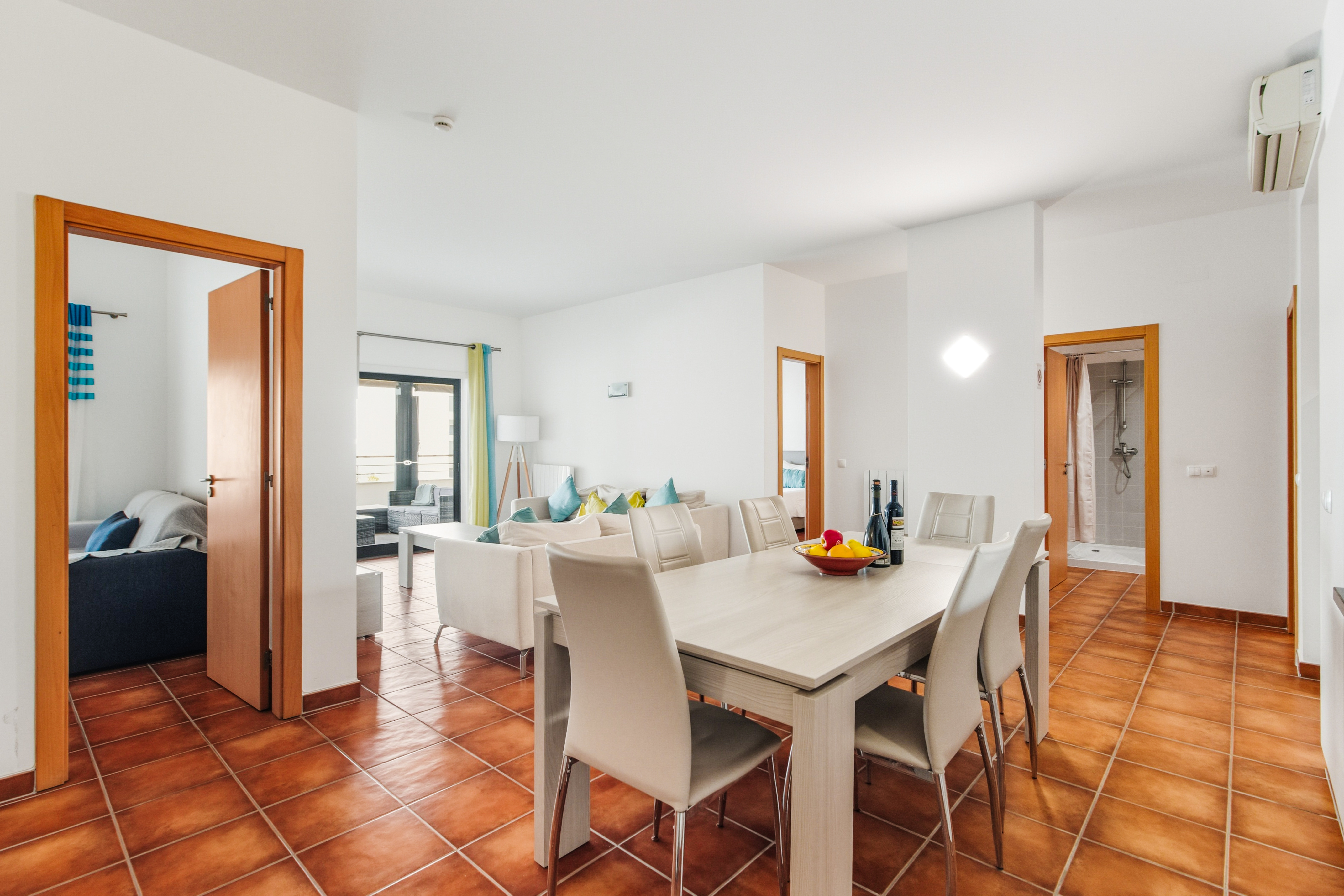 From the living room, the master bedroom, and the third bedroom there is direct access to a large balcony facing southwest, with sunlight till the end of the day which is ideal for “al fresco” dining. The master bedroom has a double bed, the second bedroom has 2 single beds, and the third bedroom has a sofa bed.