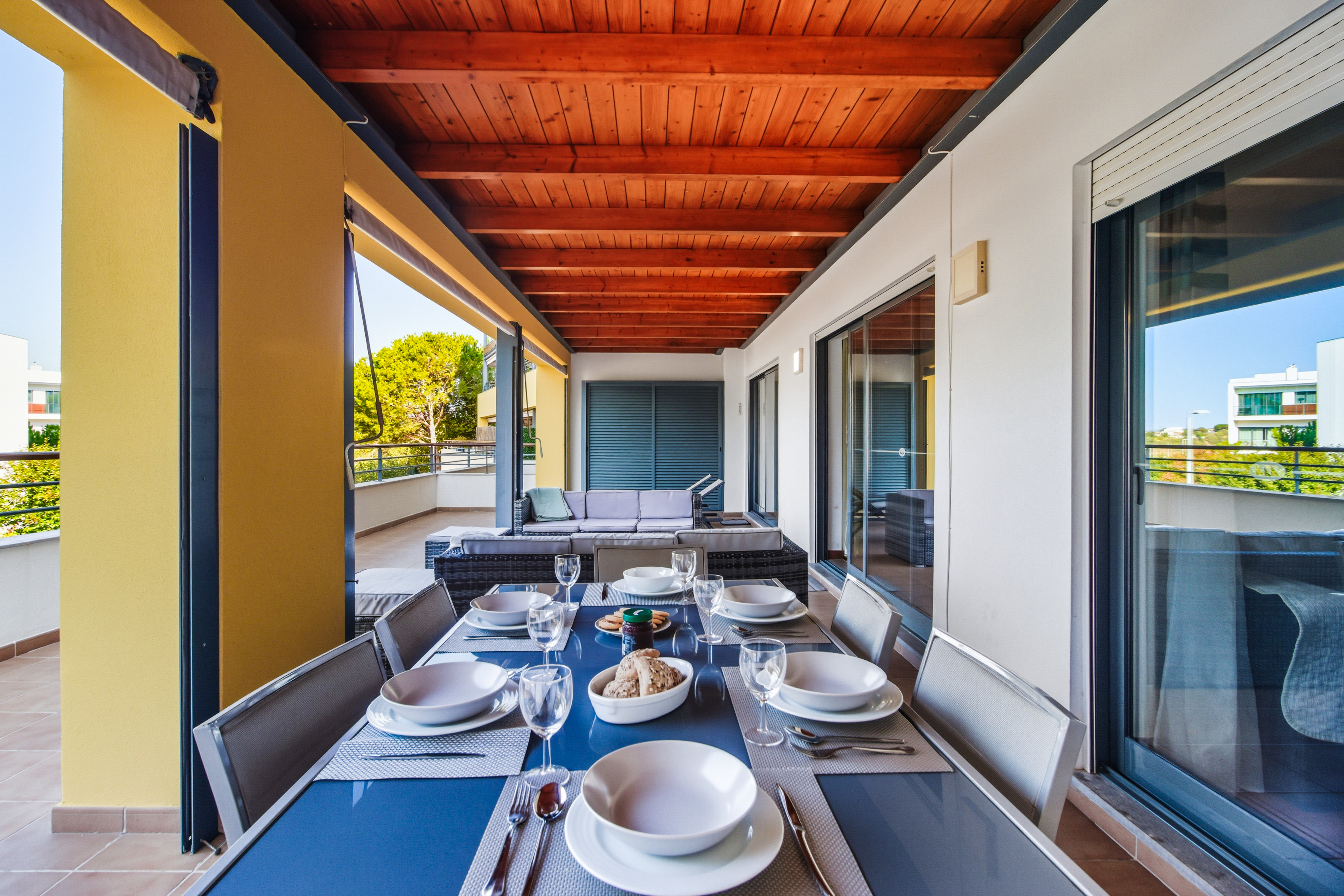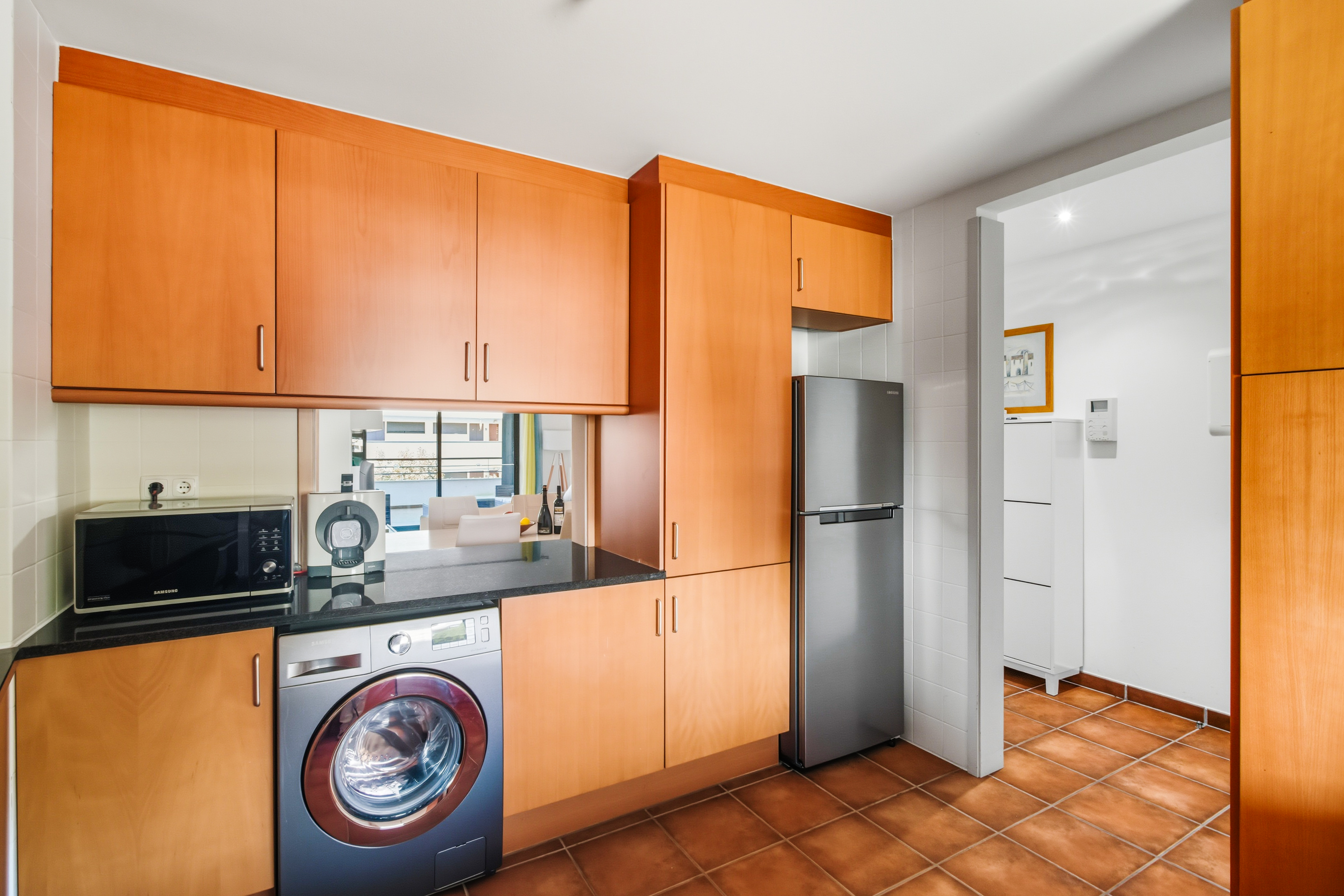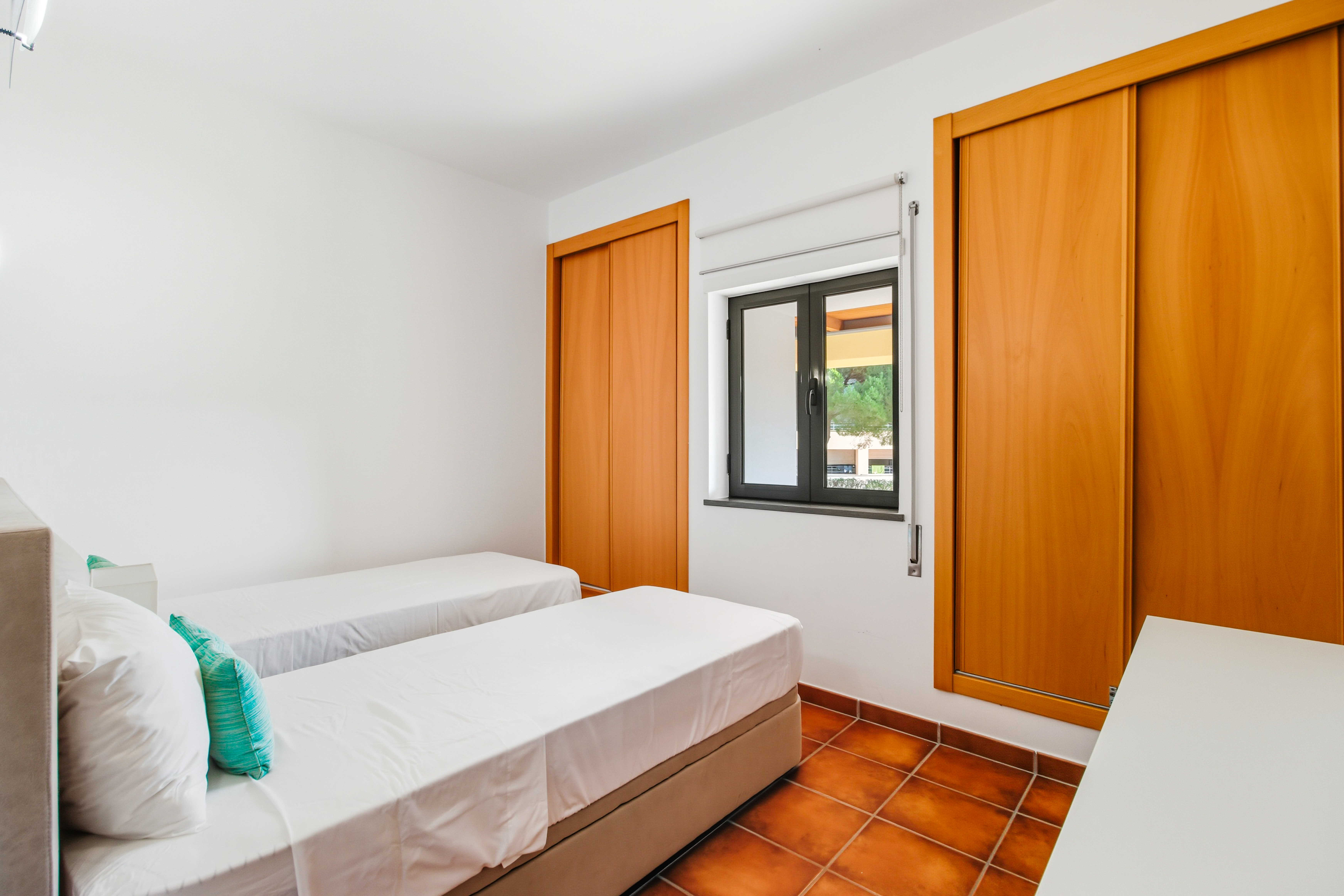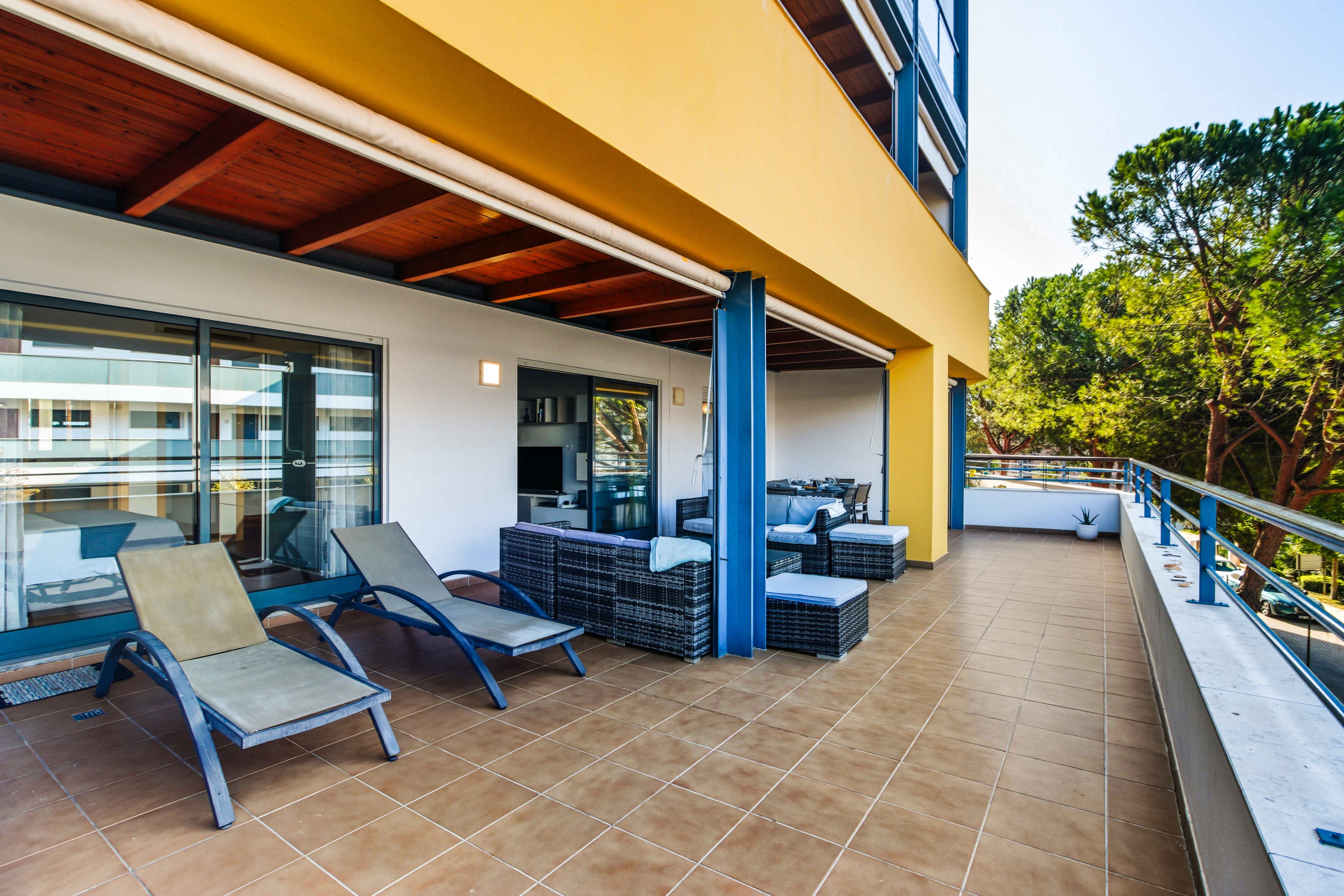From the living room, the master bedroom, and the third bedroom there is direct access to a large balcony facing southwest, with sunlight till the end of the day which is ideal for “al fresco” dining. The master bedroom has a double bed, the second bedroom has 2 single beds, and the third bedroom has a sofa bed.