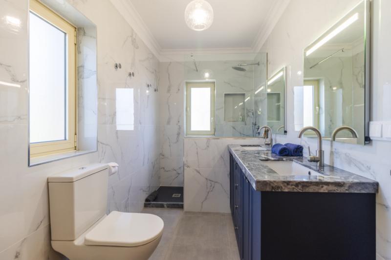 Villa Helios features three bedrooms, each offering mesmerizing sea views! The downstairs double bedroom boasts a marble en-suite walk-in shower and a direct access to the terrace through the sliding door. Upstairs, the double bedroom features an en-suite shower room and a balcony with amazing ocean views. The twin room is serviced by a family bathroom across the corridor.