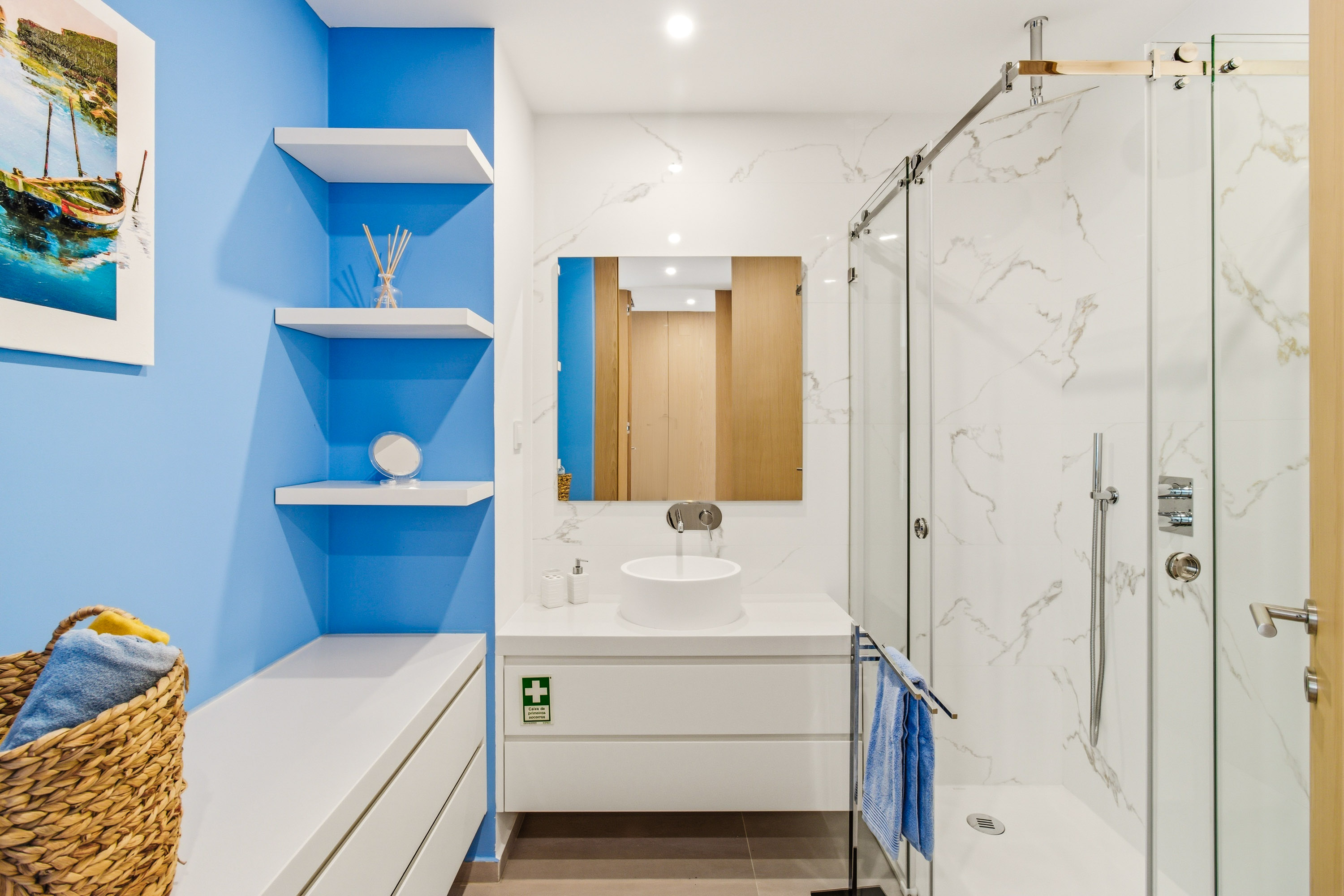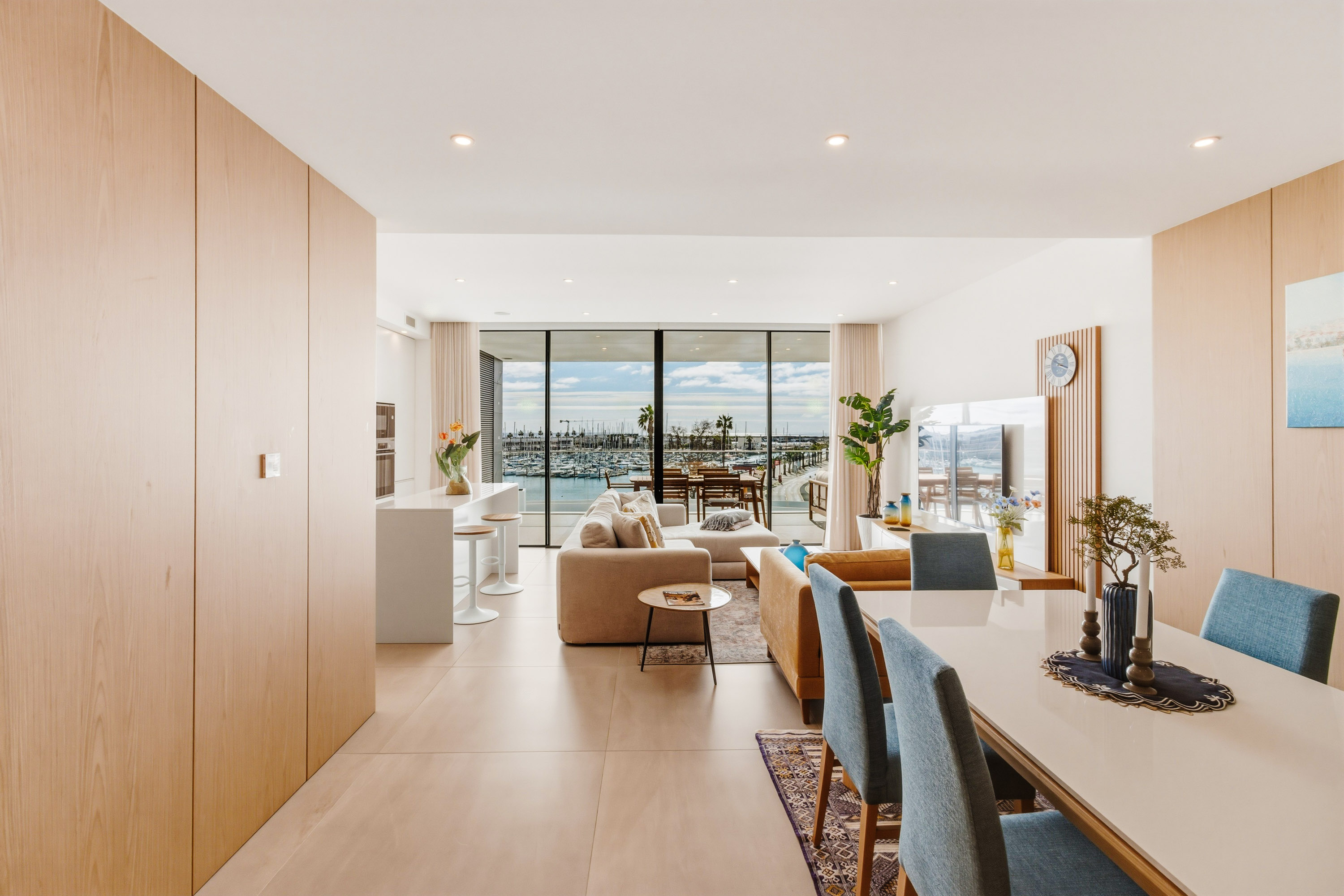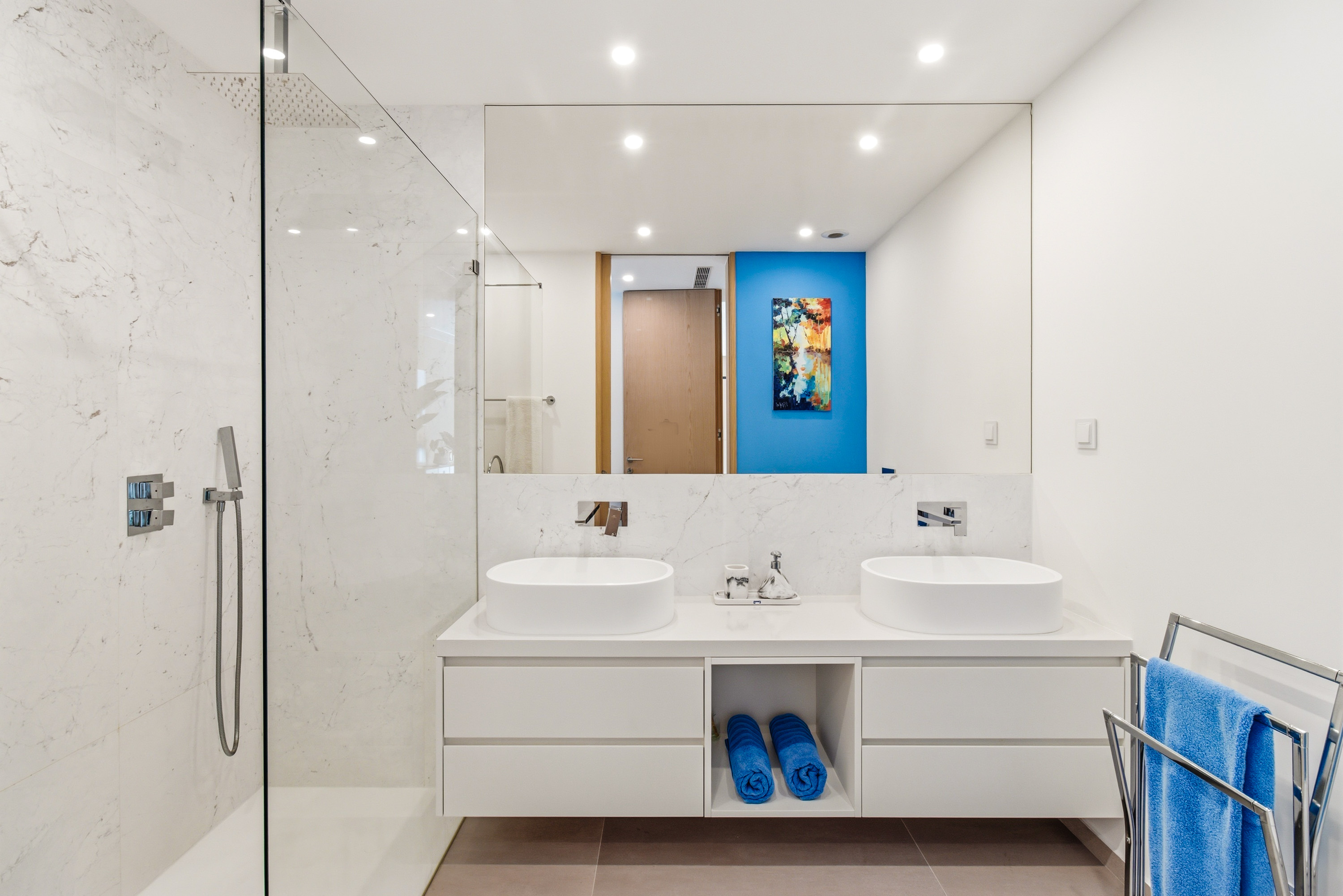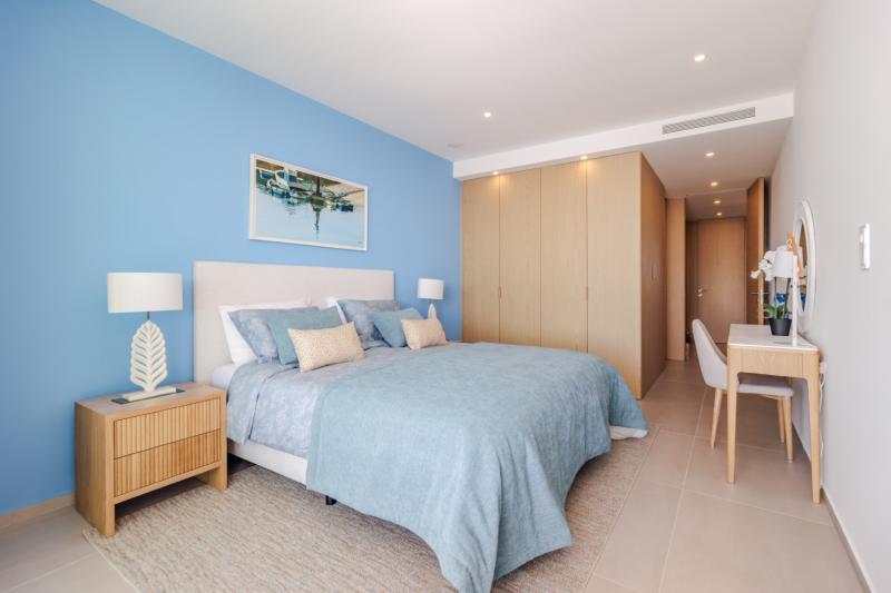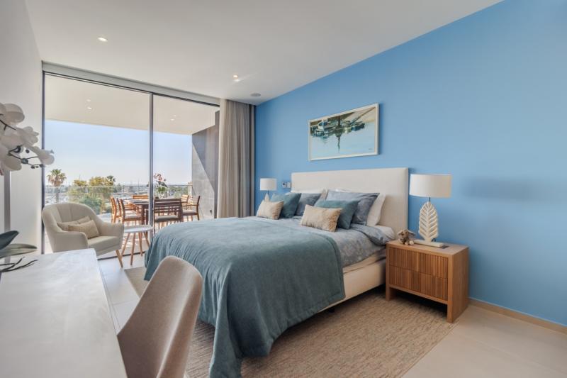 • Blue master suite: With large double bed, built-in wardrobe, desk, access to the sea and marina-facing balcony, and en-suite with double vanity unit and walk-in shower.