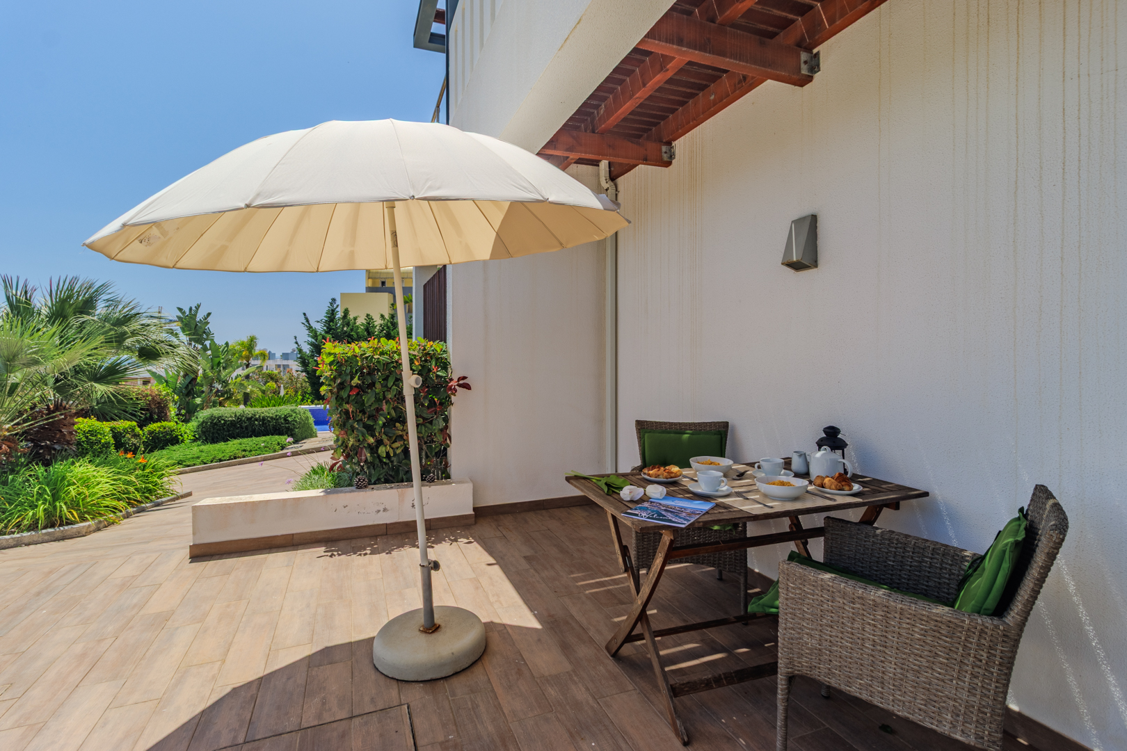 Apartment D is on the ground floor with easy access to the pool. Stepping out of your door onto its own terrace, you can take in views of the sea. There is a double bedroom (with an en-suite shower-room), a 2nd shower-room, and the living room sofa bed can accommodate up to 2 extra children for an extra fee of €25/week.