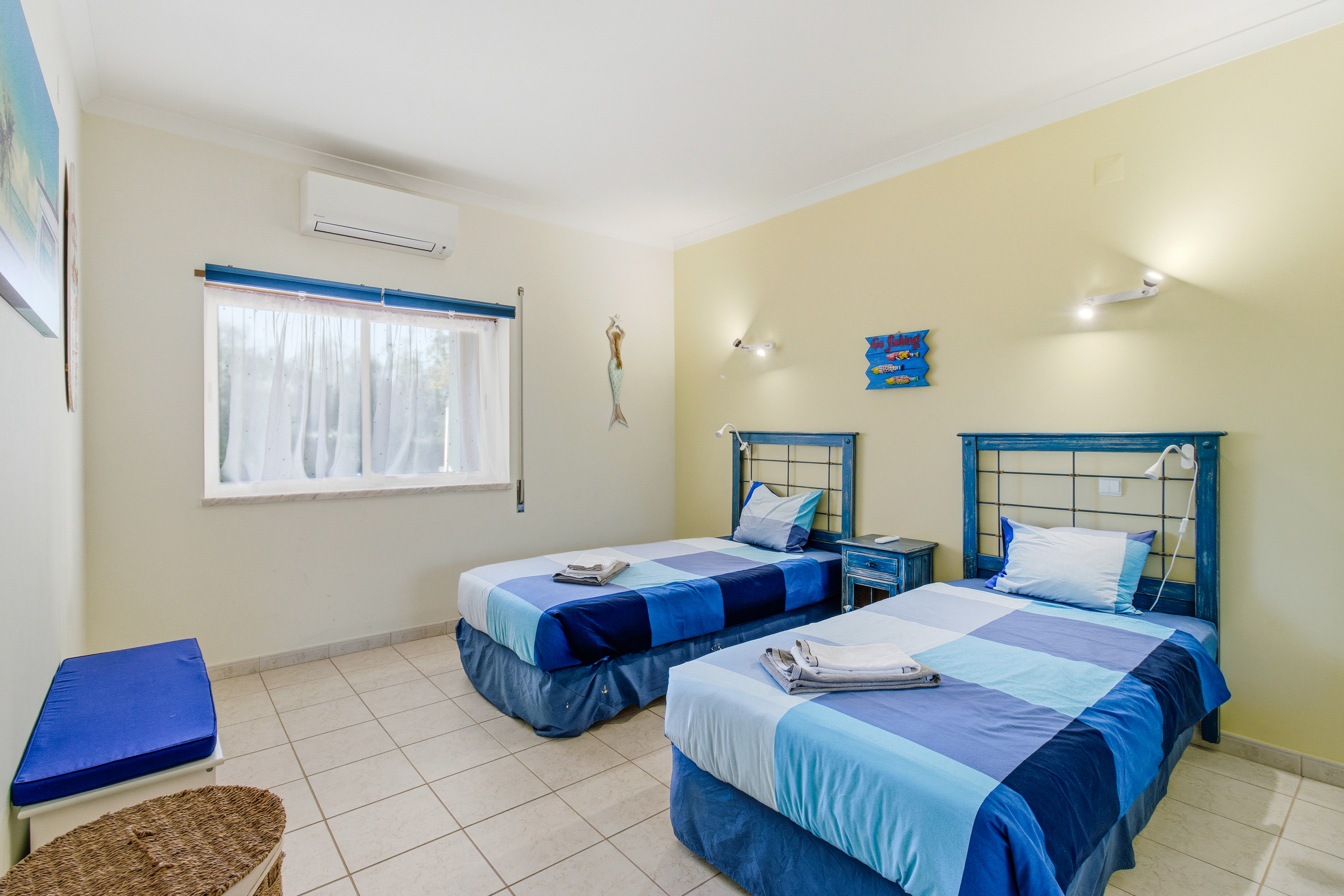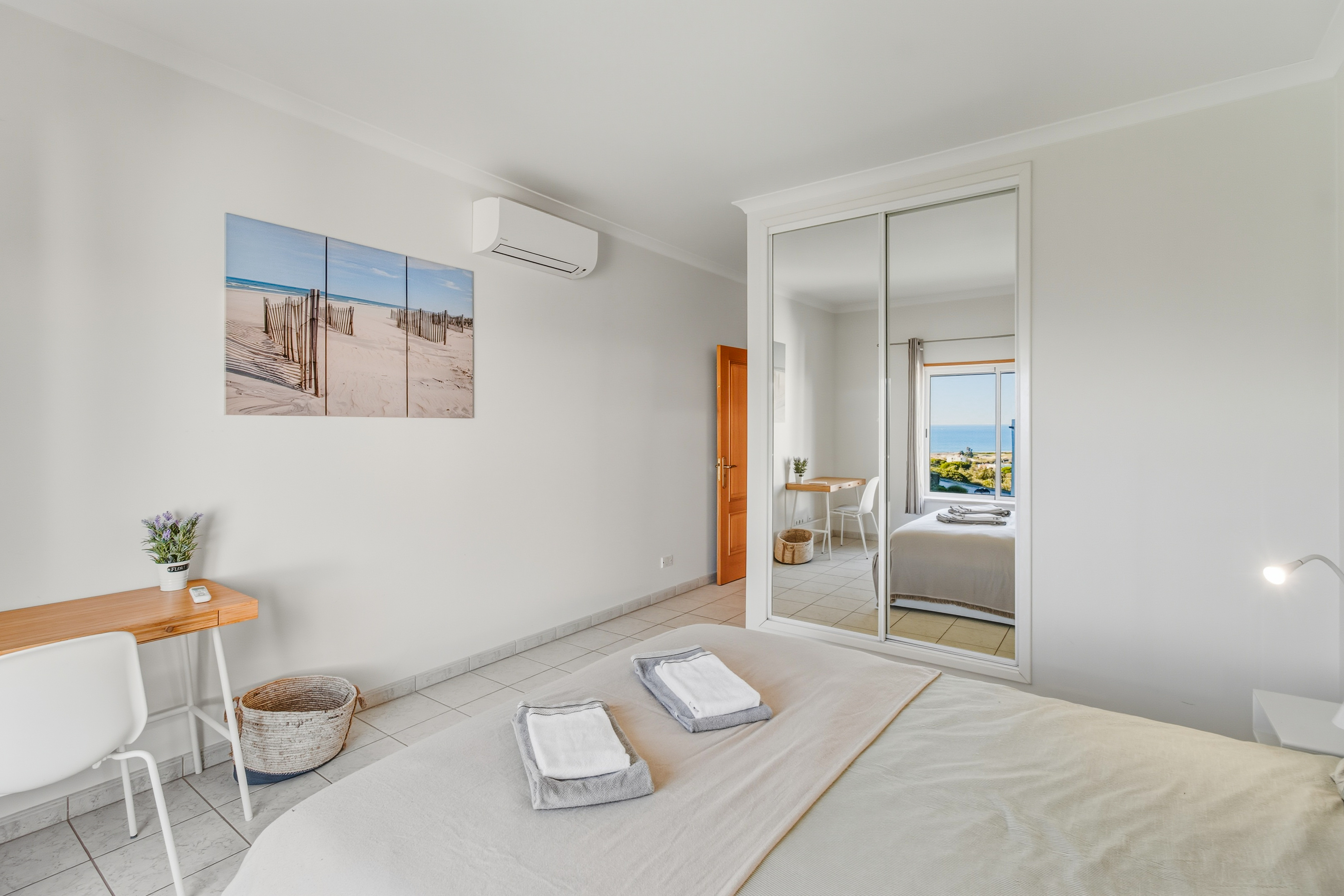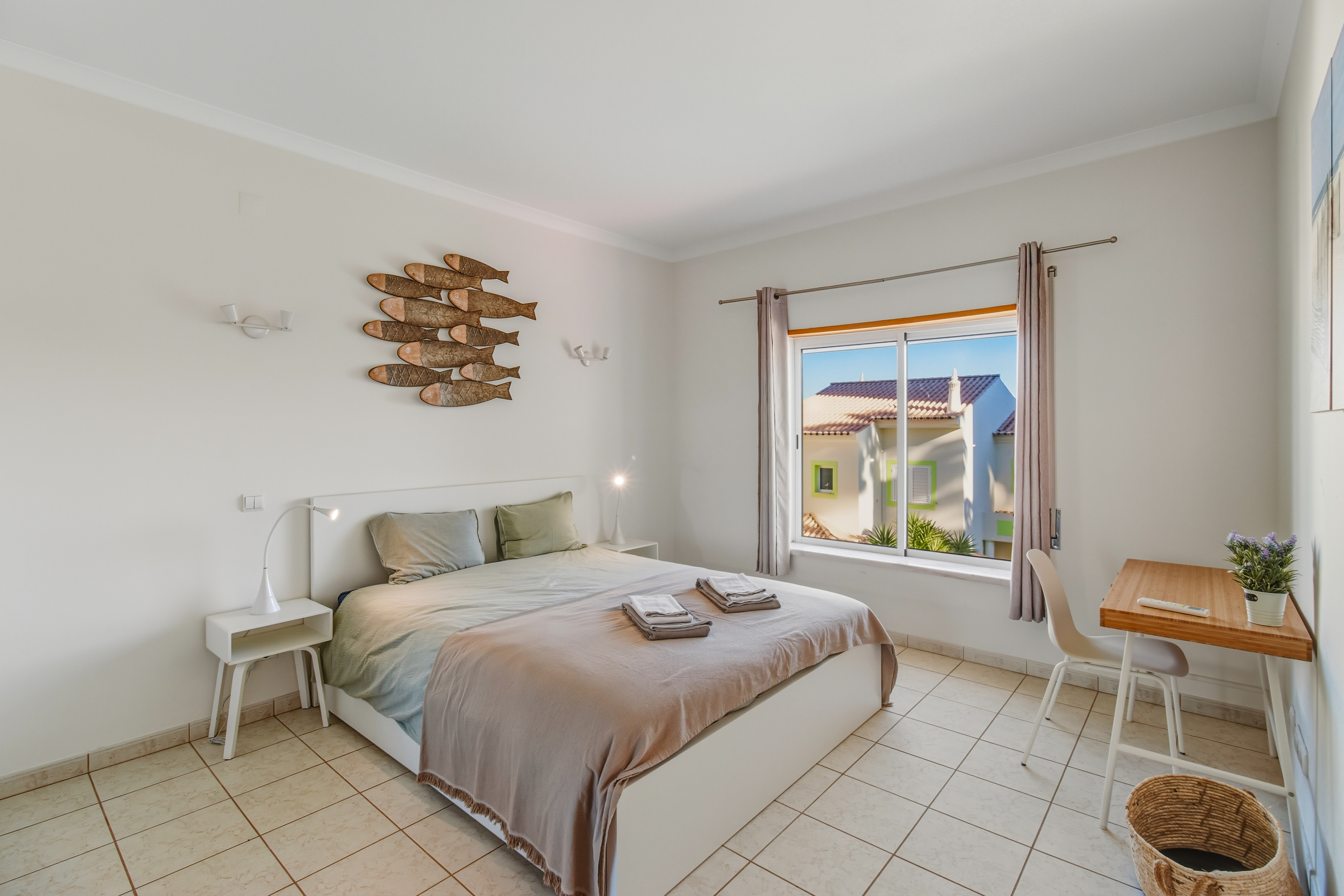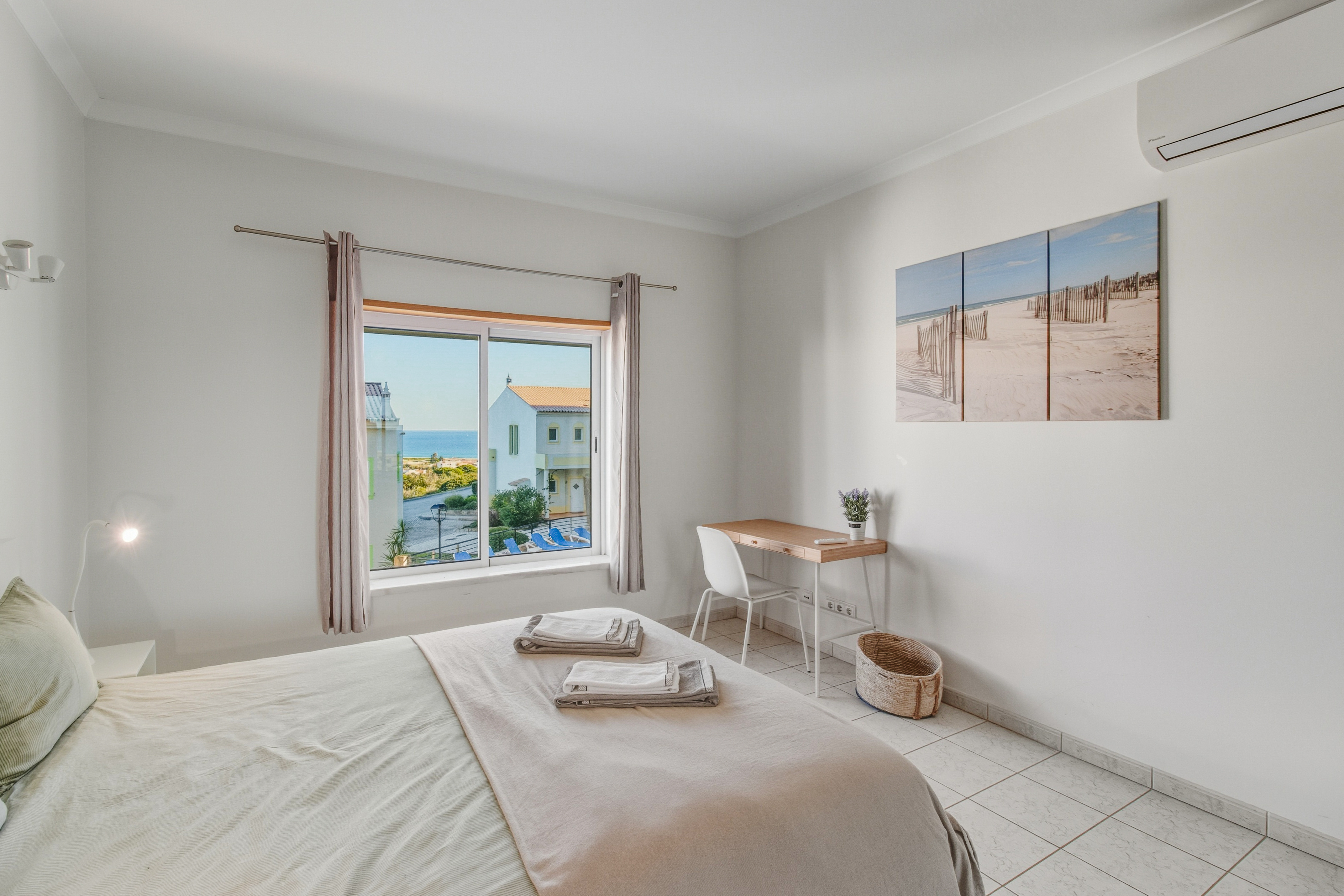 Both bedrooms are large, the master bedroom with a double bed boasts lovely sea views, and the 2nd bedroom has 2 single beds.
