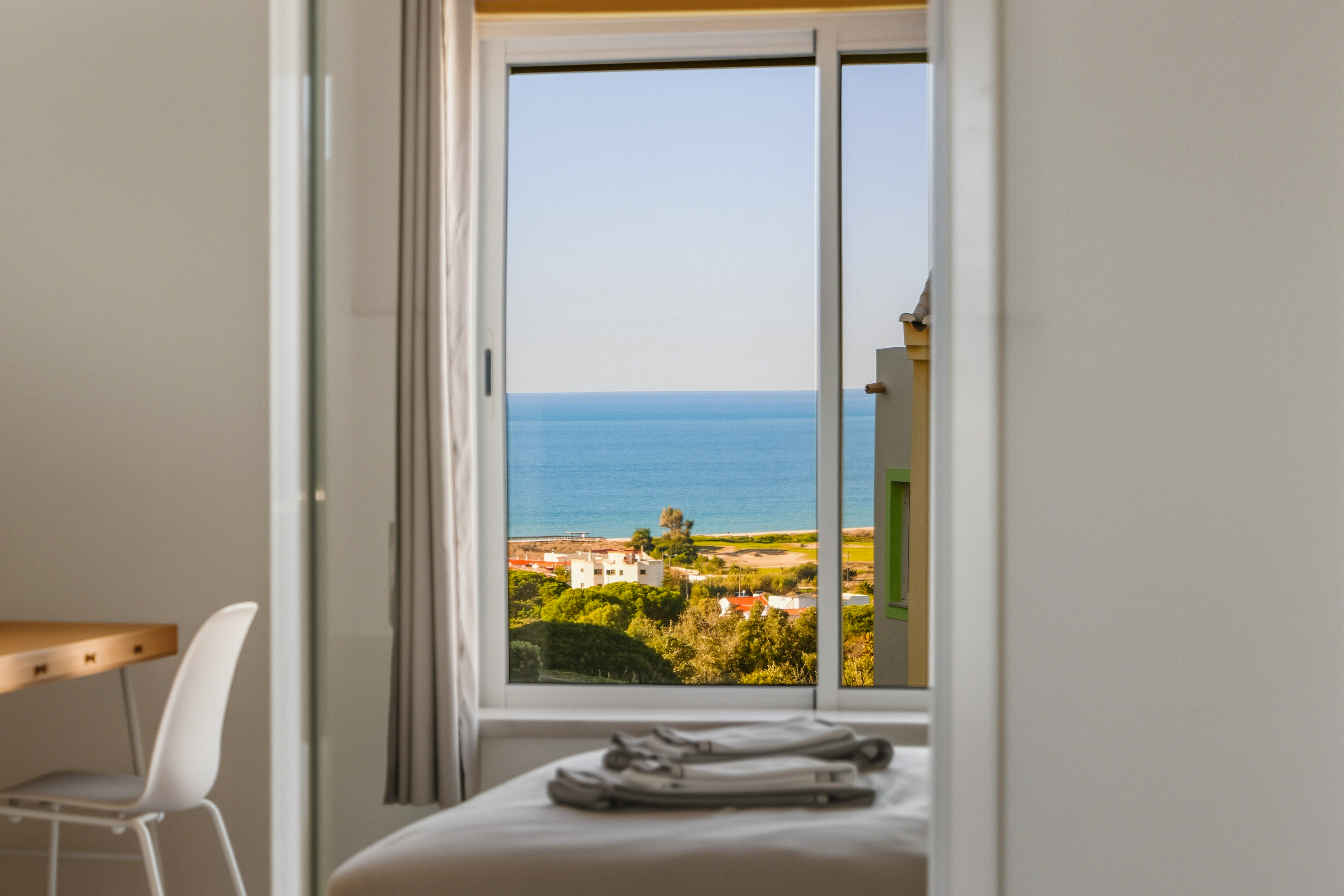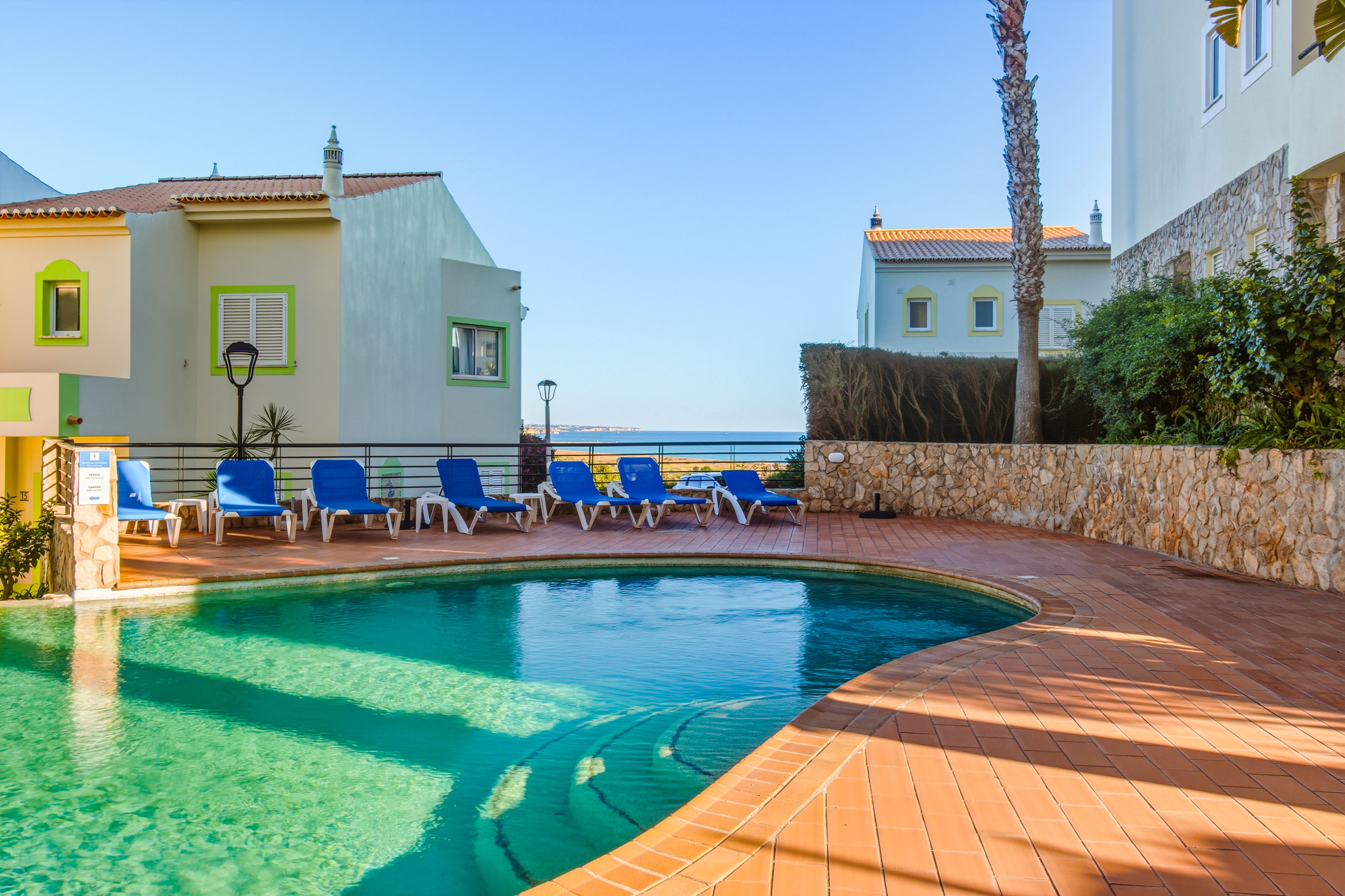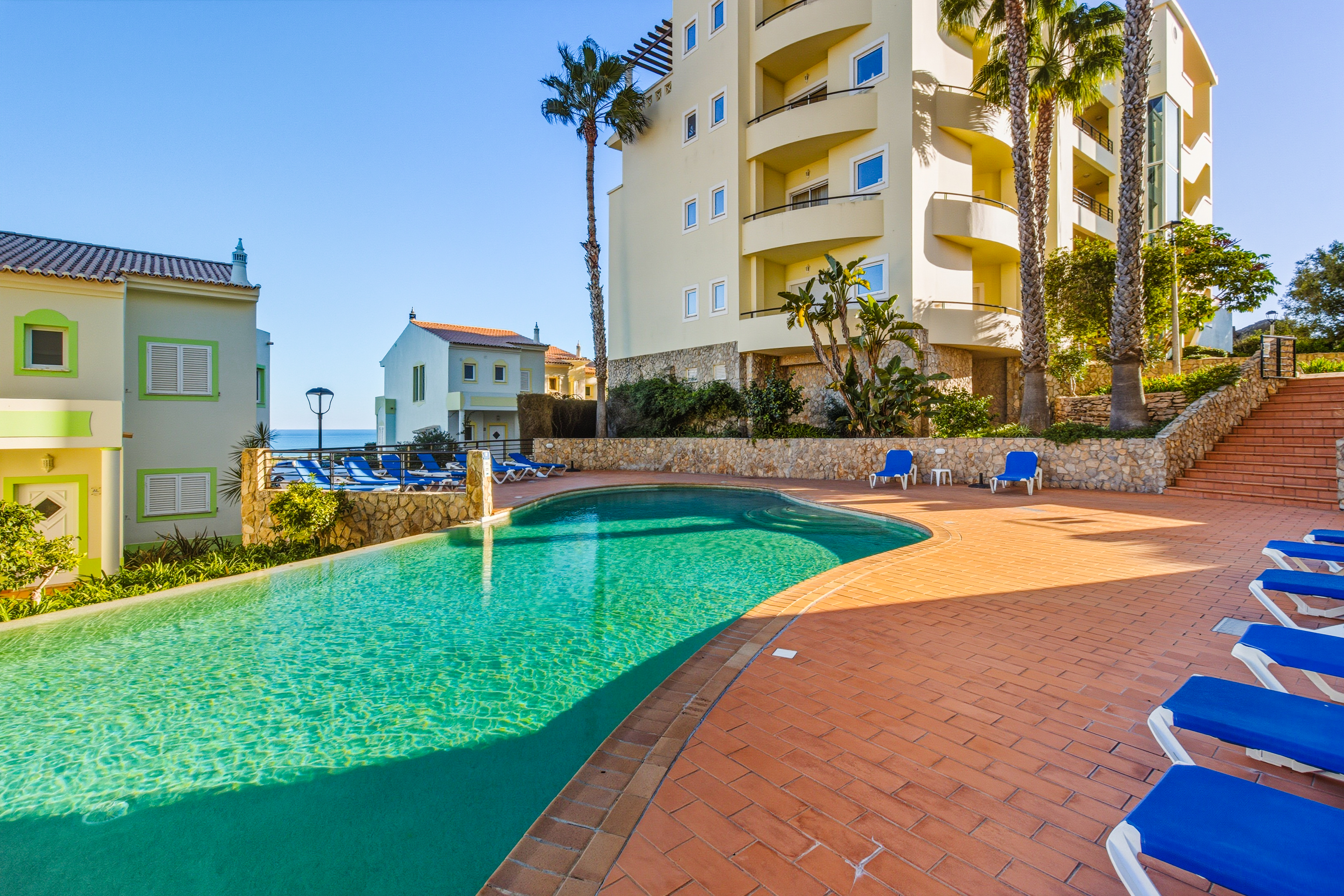The resort benefits from 2 swimming pools, reception and mature gardens and has amazing sea views as it sits on a hillside looking out to sea close to Meia Praia in Lagos.