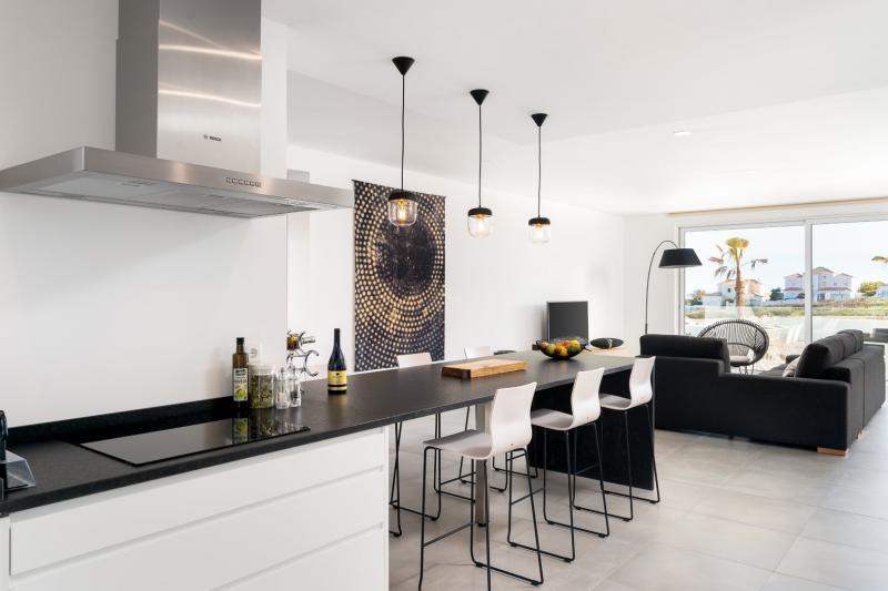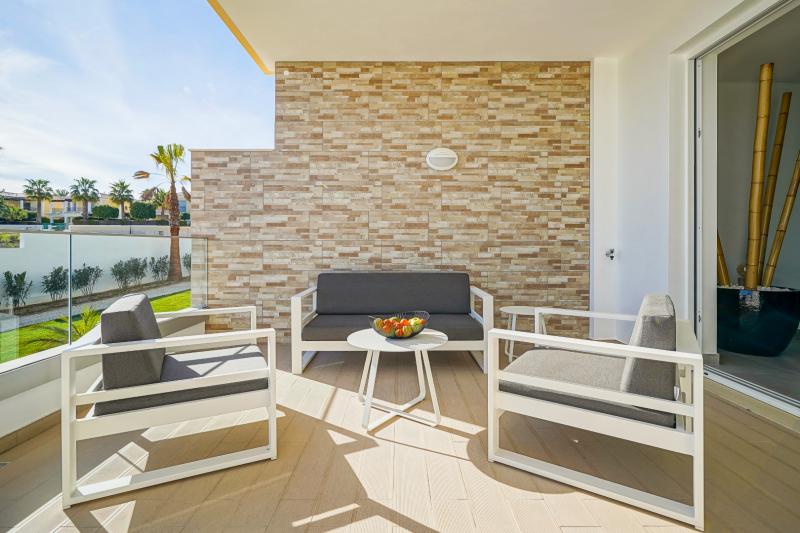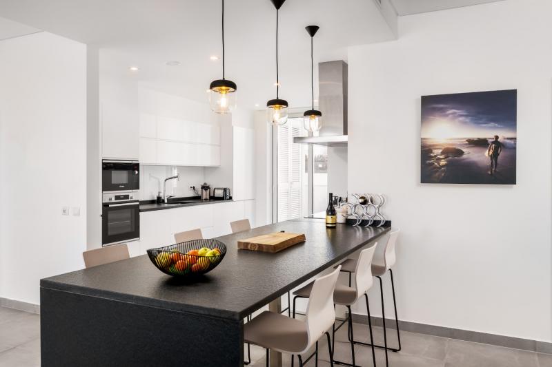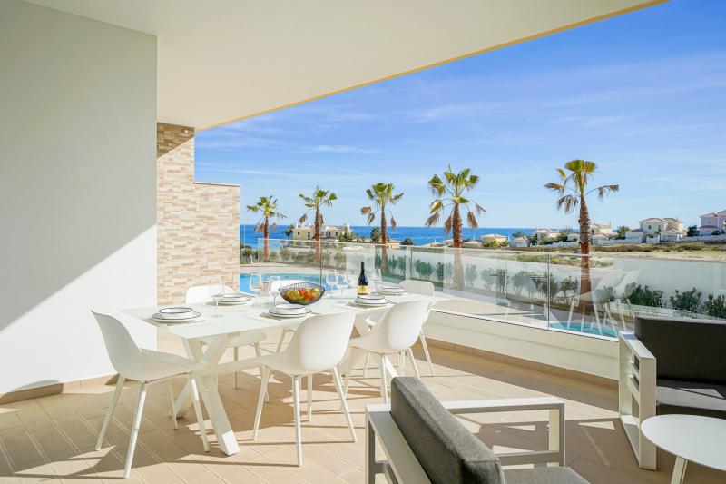 This very special apartment has been decorated with impeccable taste and furnished with exceptional quality. The interior is light and sophisticated, starting with the open-plan living space incorporating the kitchen, dining area, and living room. The kitchen is fully equipped with state-of-the-art appliances and has a service balcony through patio doors. The living room flows easily outside to the large balcony with areas for both dining and relaxing, the perfect spot to enjoy a drink whilst watching the sunset. The balcony has a glass wall enable you to fully appreciate the gorgeous views and a gate which allows direct access down to the pool terrace.