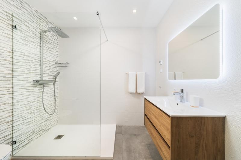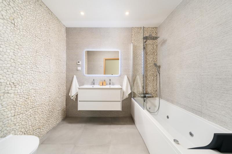 There are three spacious bedrooms, one with a double bed, and the other two with two single beds each. The double bedroom has access to a bathroom with a hydromassage bathtub, and the twin bedrooms share a shower bathroom.