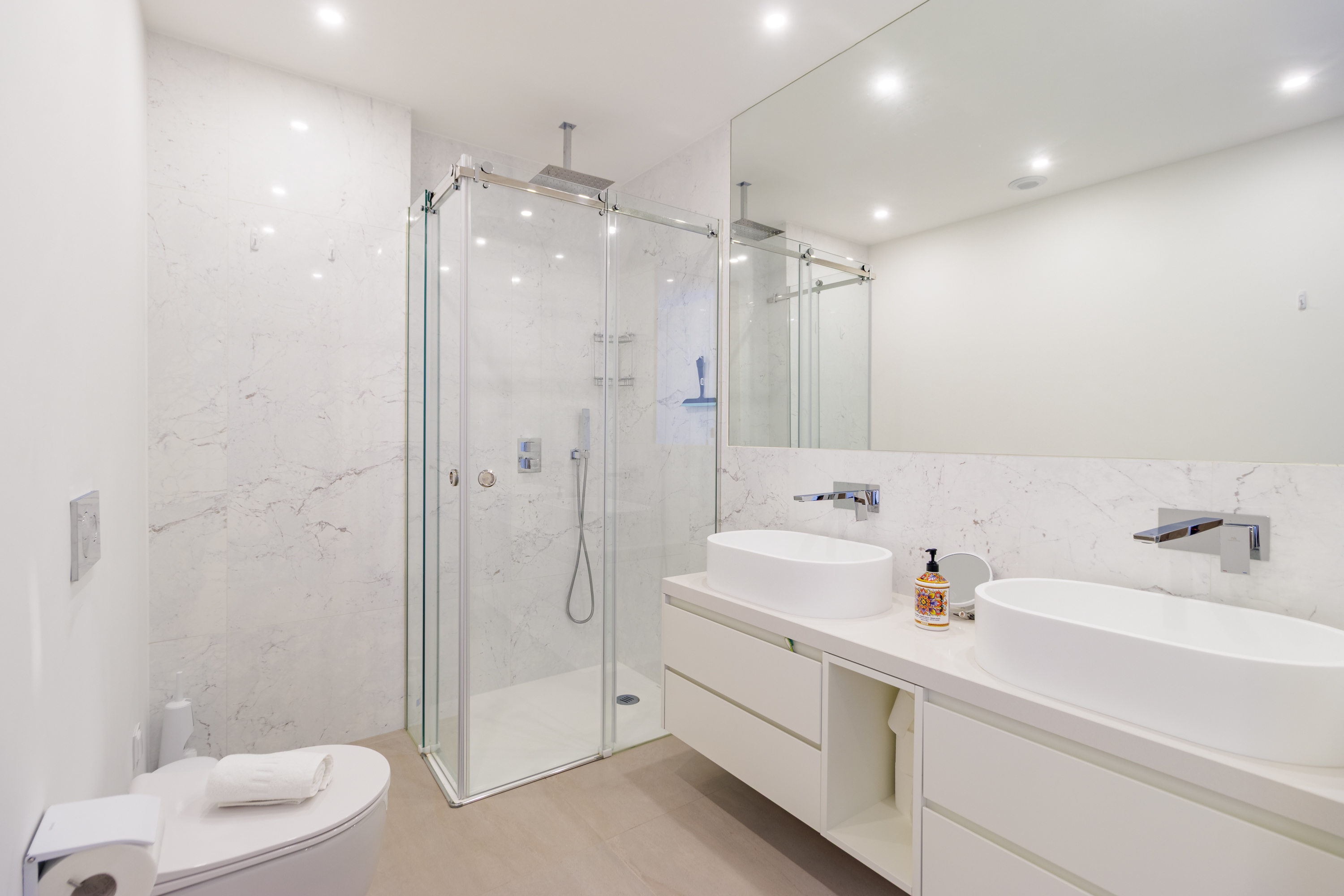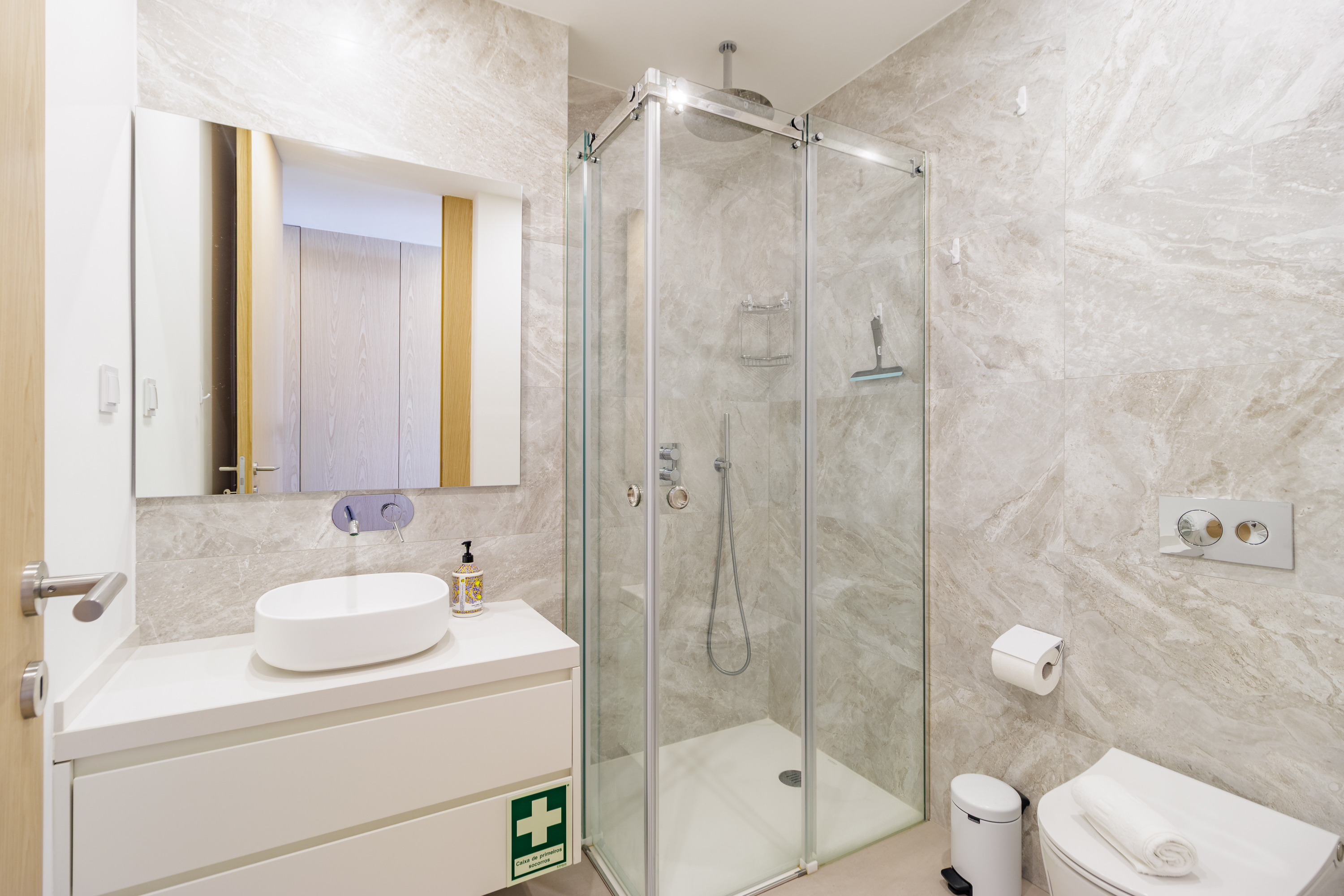 The apartment offers three spacious and beautifully furnished bedrooms. The master bedroom features a luxurious king-size bed, TV, and a private en-suite bathroom. The other two bedrooms are equally comfortable, each with single beds pushed together. One can be set up as a twin, and the other as a king-size bed, offering complete flexibility for families or groups. These rooms share a modern bathroom located in the hallway.