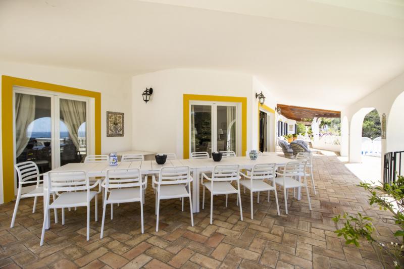 The villa includes a very large living and dining room which opens out into a dining terrace overlooking the pool and garden. Outside there are several terraces affording numerous seating options from small to large tables, comfortable seating and occasional chairs. There is a gas barbecue, and around the pool area are sun loungers and parasols.