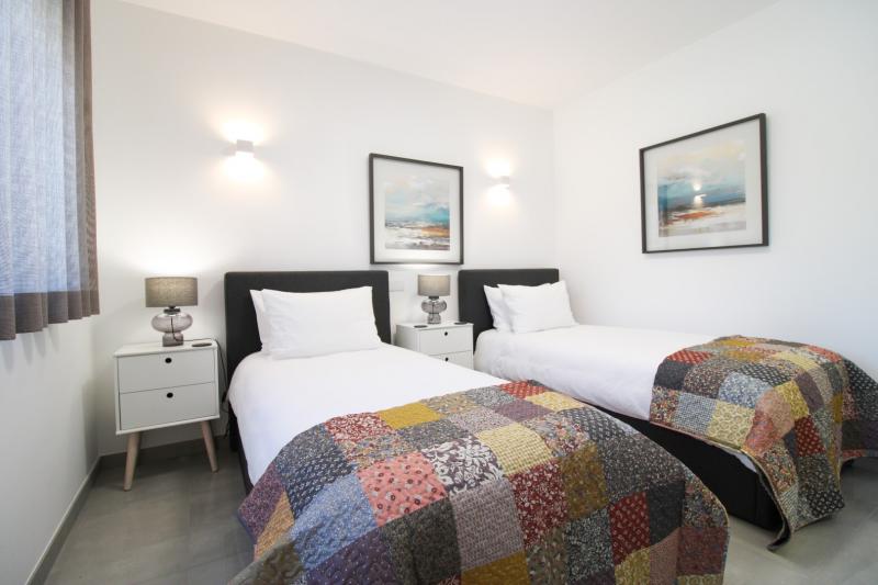 On the ground floor, a twin bedroom with a built-in wardrobe and adjacent shower room provides privacy and convenience for guests.