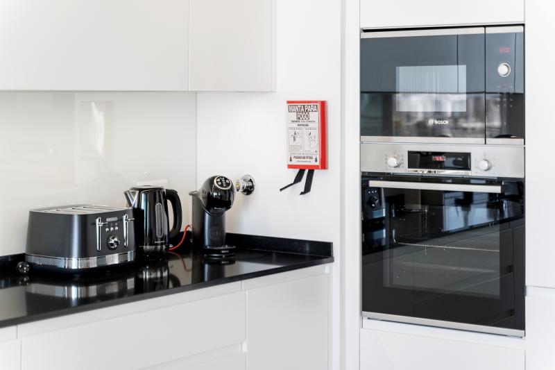 The kitchen is fully equipped with the latest appliances, including induction hob, oven, fridge-freezer, microwave, washing machine and dishwasher.