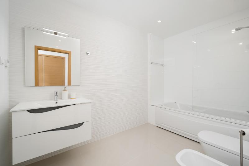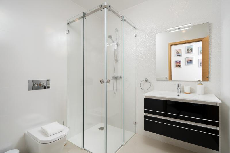 There are 2 spacious bedrooms, one with double bed, one with twin beds and a full bathroom and shower room. Both bedrooms have direct access to the second balcony, which overlooks the sparkling swimming pool.