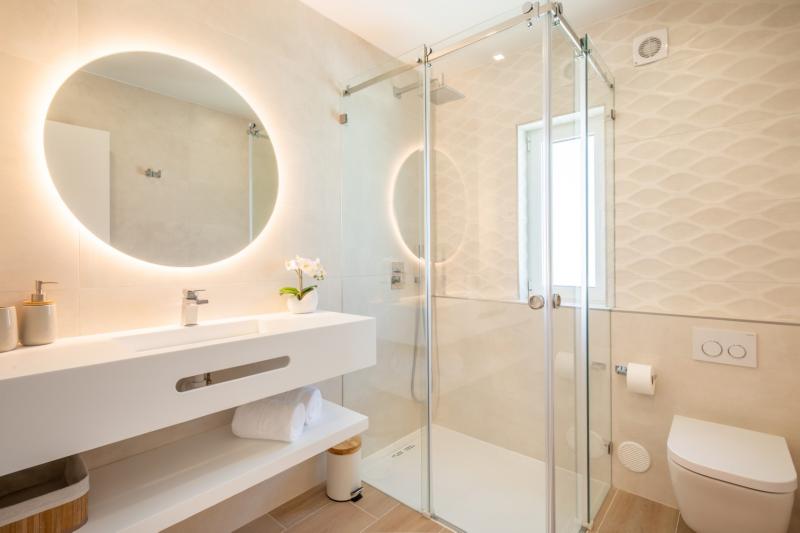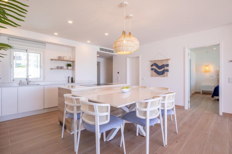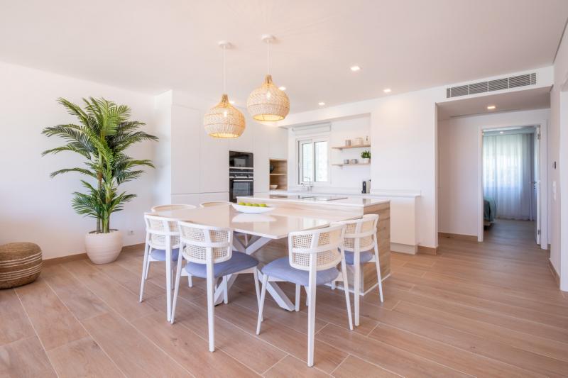 The dining room shares the same environment as the kitchen and comfortably seats six people. The beautiful pair of lamps above the table turns any meal into a pleasant intimate feast. Towards the balcony, you have the living room with a cosy sofa and Smart TV connected to high-speed internet. The main streaming apps are available, so you won’t miss any episode of your favourite series.