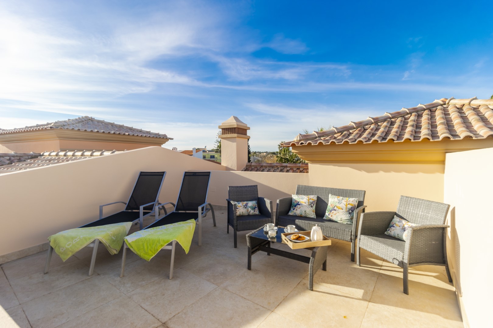 Arriba se puede encontrar la habitación doble, la habitación doble (con camas con cremallera y eslabones que se pueden arreglar como 2 individuales o una doble grande) y un baño con bañera de hidromasaje y ducha. Las 2 habitaciones son espaciosas con armarios empotrados y la doble con terraza que ofrece impresionantes vistas del campo al mar. Desde esta terraza hay una escalera de caracol que conduce a la terraza privada en la azotea, perfecta para tomar el sol o disfrutar de las fabulosas vistas.