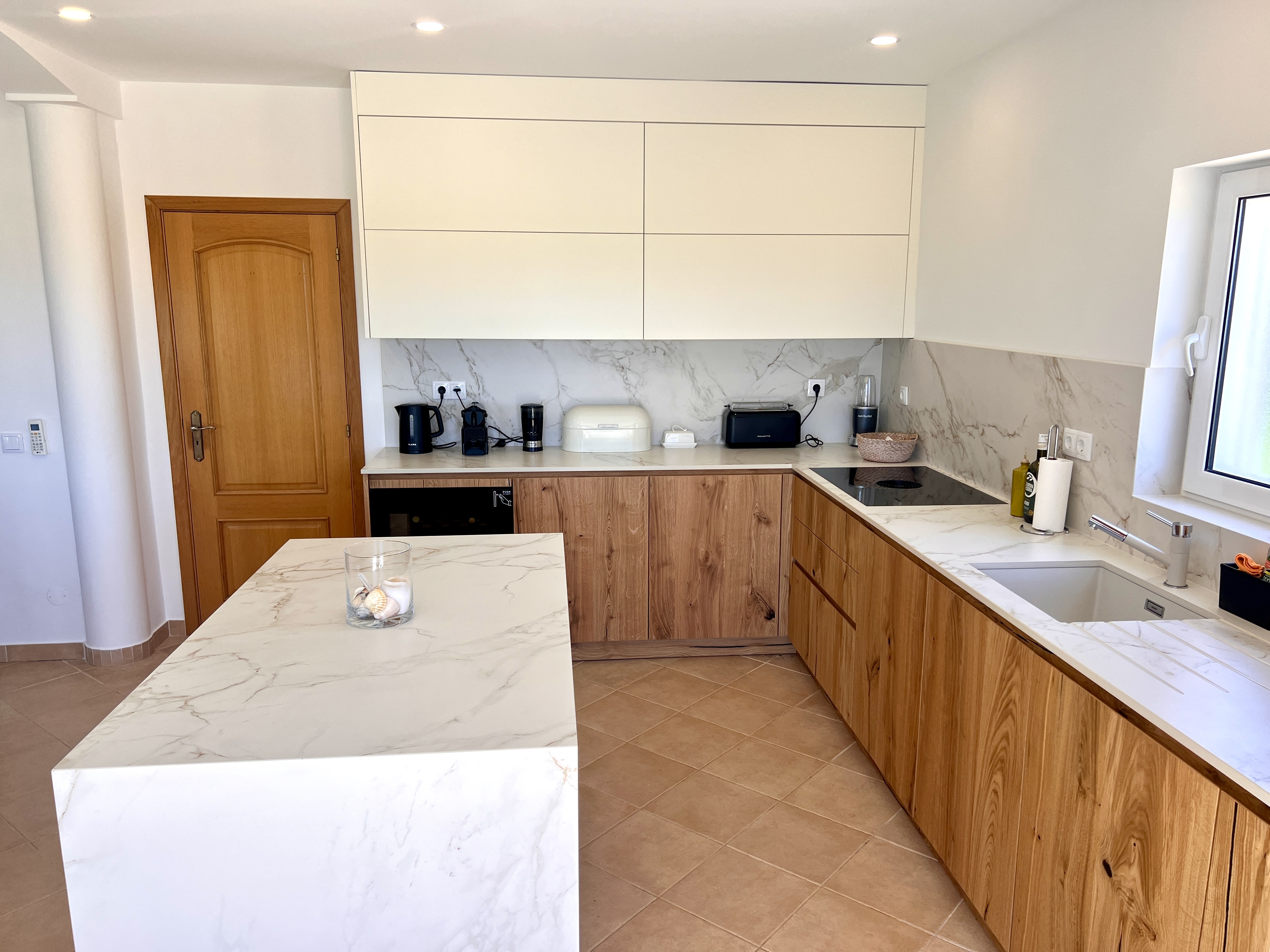 The living-dining area and open plan kitchen are all on the first floor and all lead to a generous sunny south-facing terrace with gas Weber BBQ, dining set for 8, as well as the comfortable sheltered corner lounge set.