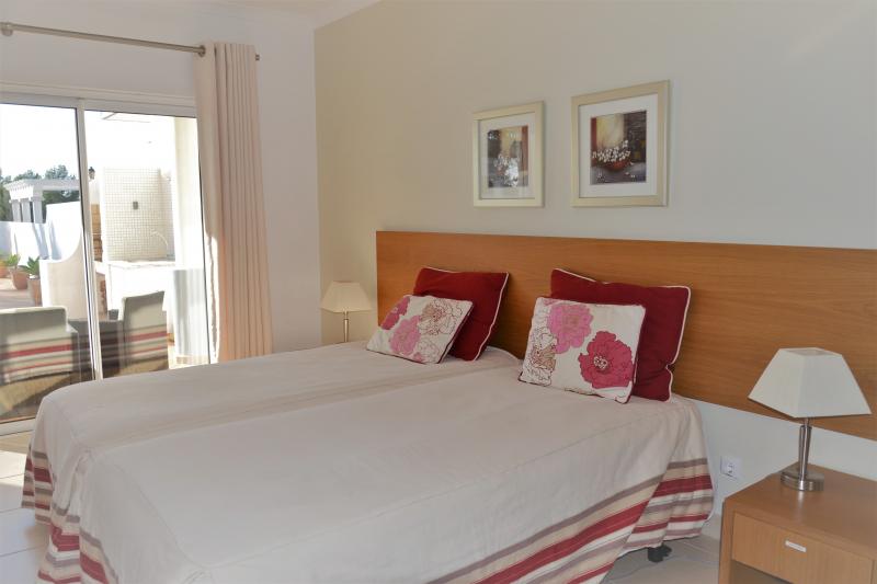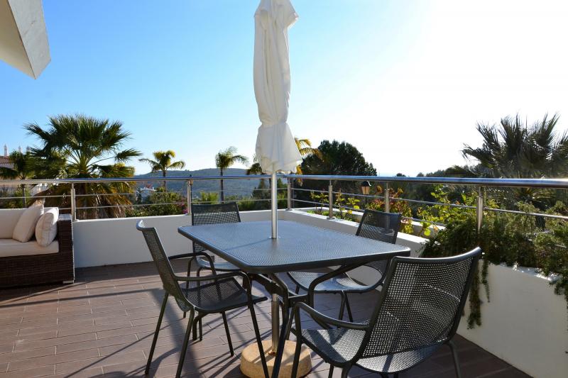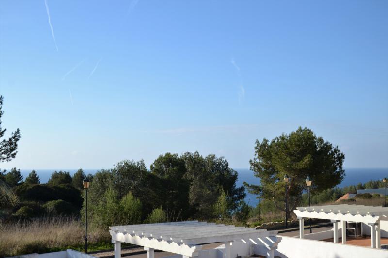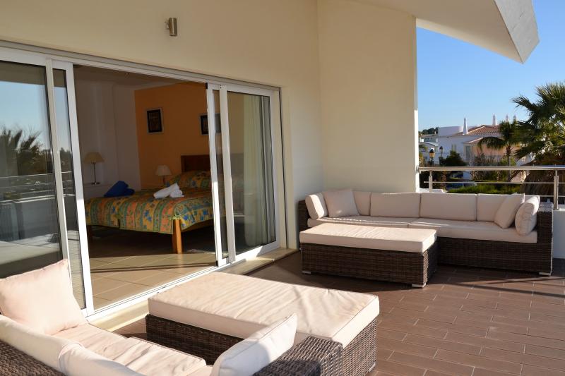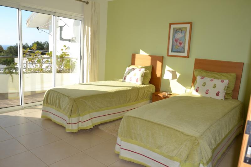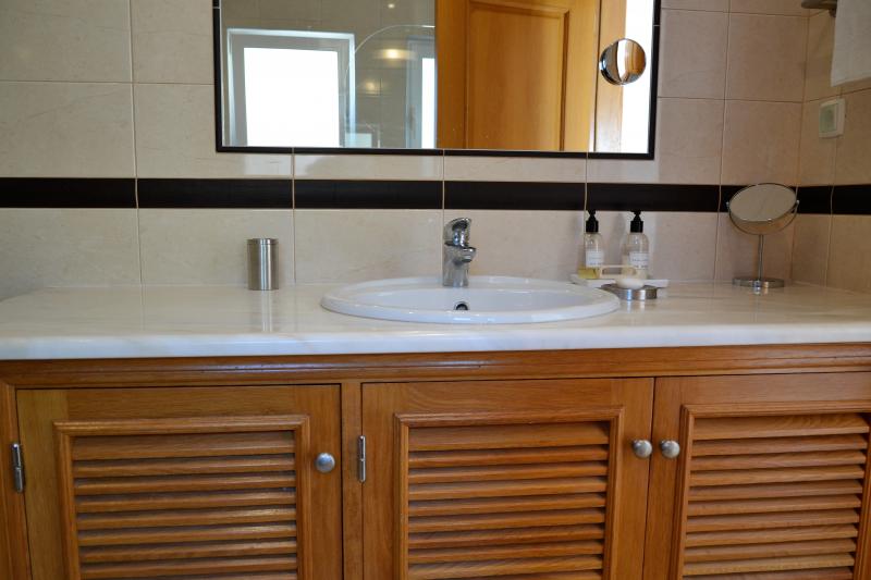 Arriba, en el 1er piso hay 2 dormitorios más; una habitación doble con baño en-suite y el dormitorio principal con cama king-size y baño con bañera y ducha. Ambas habitaciones se abren al gran balcón cubierto que da a la piscina y al mar.