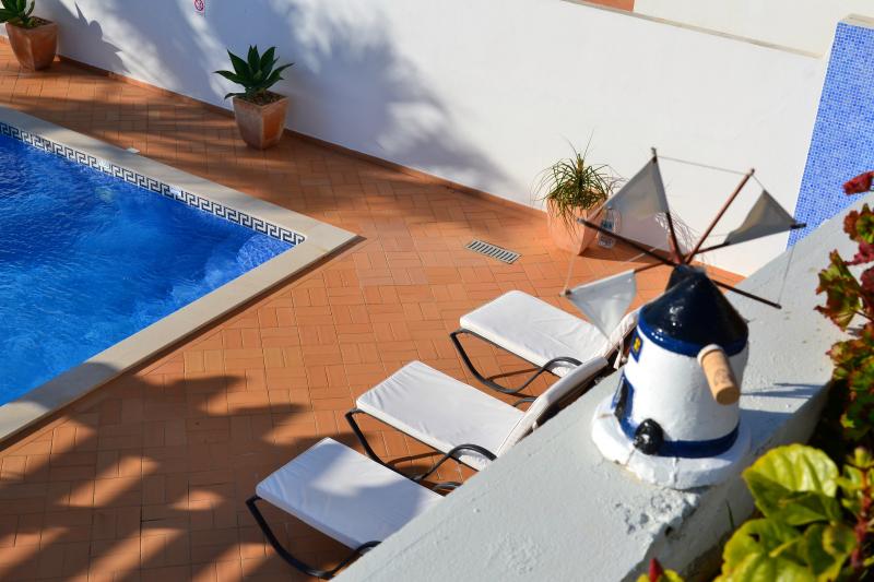 La sala de estar y el dormitorio conducen a la terraza de la piscina, donde encontrará la zona de barbacoa, mesa y sillas de comedor, tumbonas, una ducha y muebles de salón al aire libre para sentarse y leer con una bebida refrescante. La piscina mide 8m x 4m y se puede calentar previa solicitud (200 € por semana).